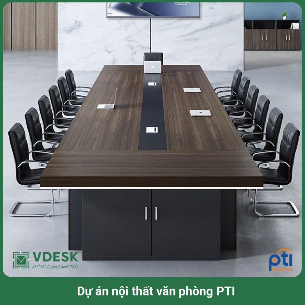 Phòng họp của PTI được VDesk trang bị các bộ bàn ghế hiện đại, kết hợp giữa bàn họp chữ nhật với ghế chân quỳ da cao cấp. Các sản phẩm này không chỉ mang lại sự thoải mái trong các cuộc họp dài mà còn thể hiện phong cách chuyên nghiệp, đồng bộ với tổng thể không gian văn phòng. Bàn họp được thiết kế với kích thước phù hợp, tích hợp hệ thống quản lý dây điện thông minh, hỗ trợ các thiết bị trình chiếu và họp trực tuyến, đáp ứng nhu cầu làm việc đa năng của PTI.