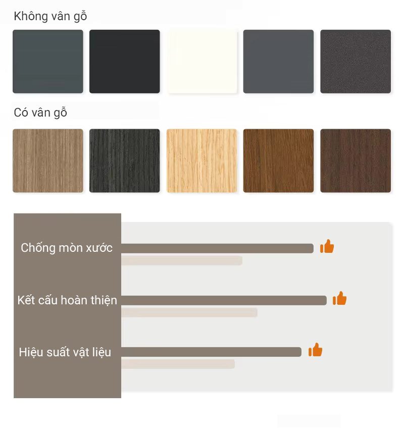 - Màu Sắc: Đa dạng màu sắc như trắng, đen, nâu gỗ, xám phù hợp với nhiều phong cách nội thất.
