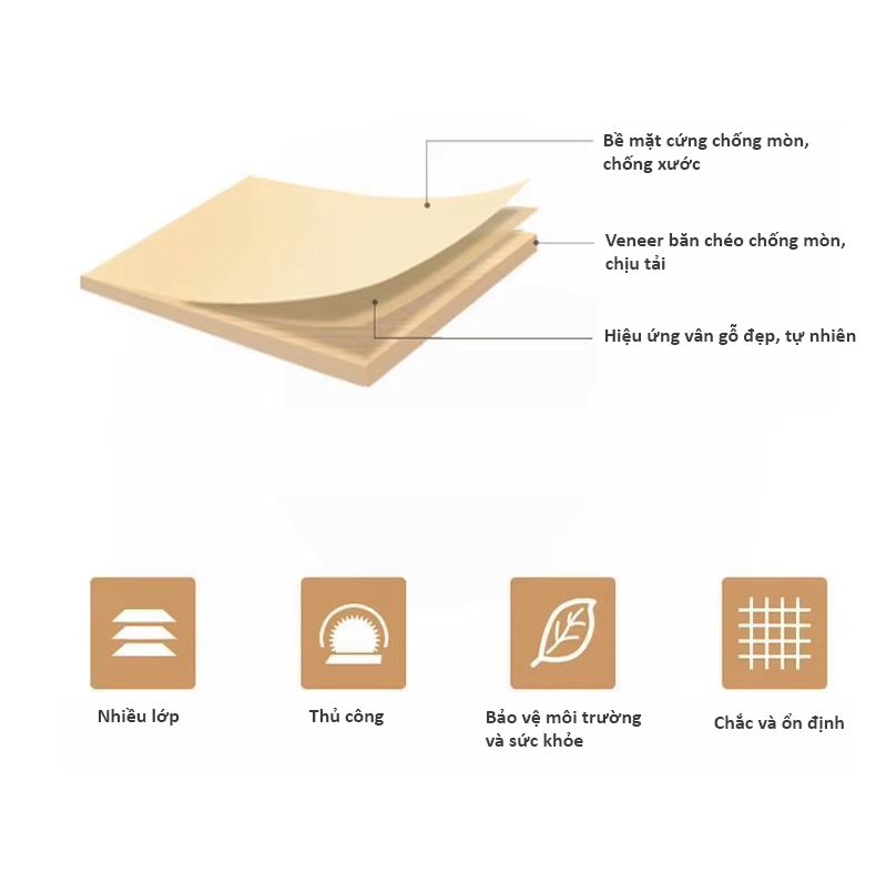 - Chất liệu cao cấp: Mặt bàn làm từ gỗ MDF phủ melamine chống trầy xước, chống thấm nước và dễ dàng vệ sinh.