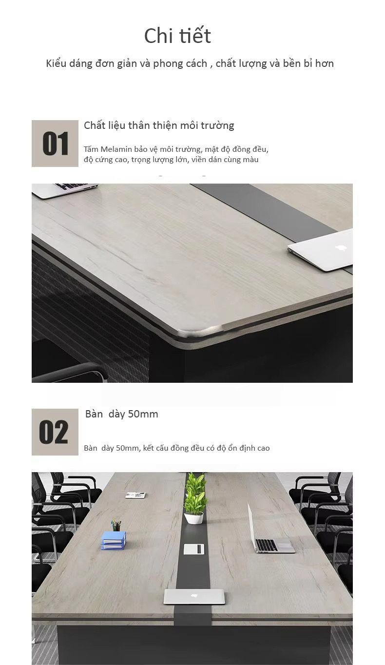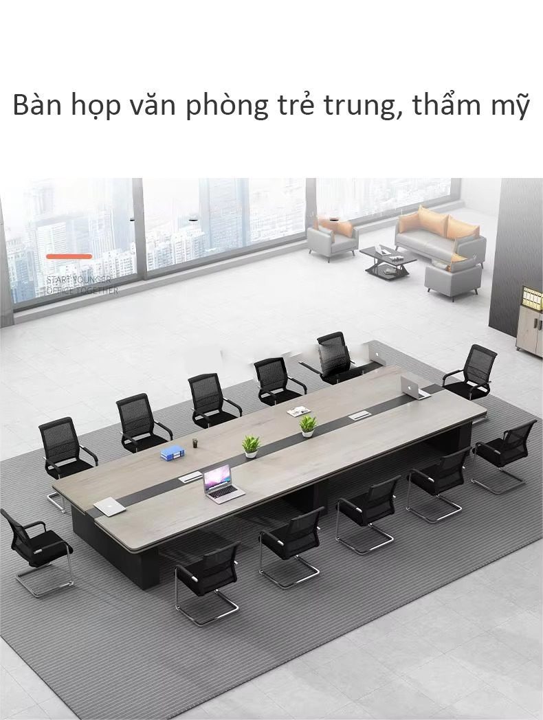 - Kích thước rộng rãi: Kích thước tiêu chuẩn 4200W x 1600D x 760H mm, phù hợp cho các cuộc họp từ 12–16 người.