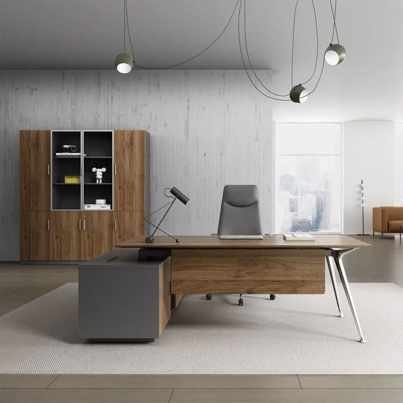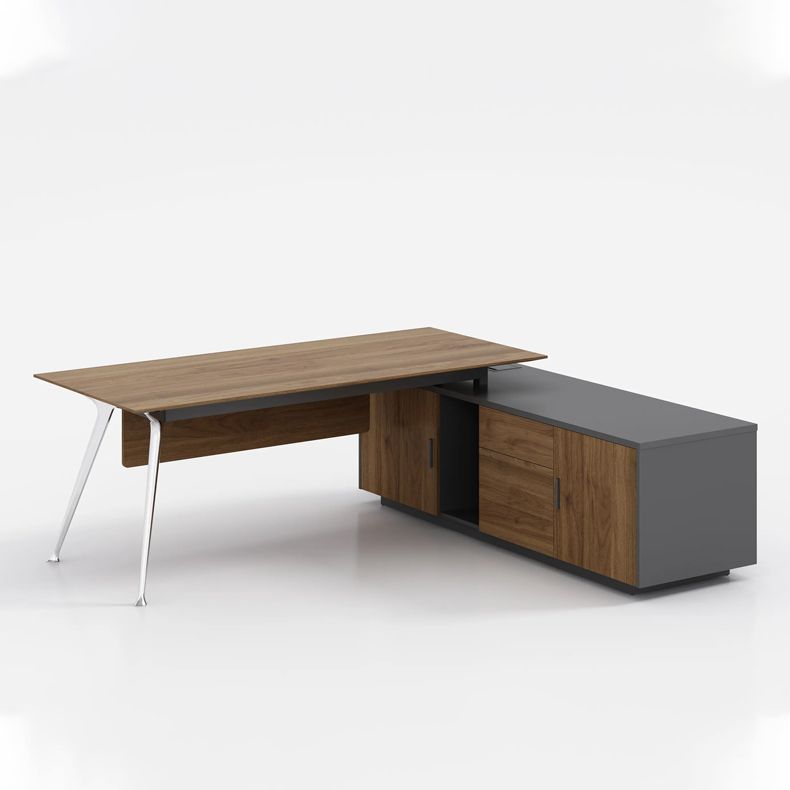 Thiết Kế Sang Trọng, Tối Ưu Không Gian: Bộ sản phẩm gồm bàn làm việc quản lý rộng rãi và tủ hồ sơ phụ tích hợp, mang đến không gian làm việc gọn gàng, chuyên nghiệp. Kiểu dáng L-shaped hiện đại giúp tận dụng tối đa góc phòng, phù hợp với mọi kích thước văn phòng.