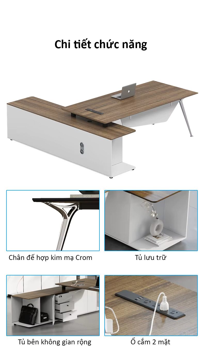 - Tích hợp tiện ích: Lỗ đi dây điện tiện lợi, bề mặt làm việc bọc da thật hoặc da PU cao cấp.