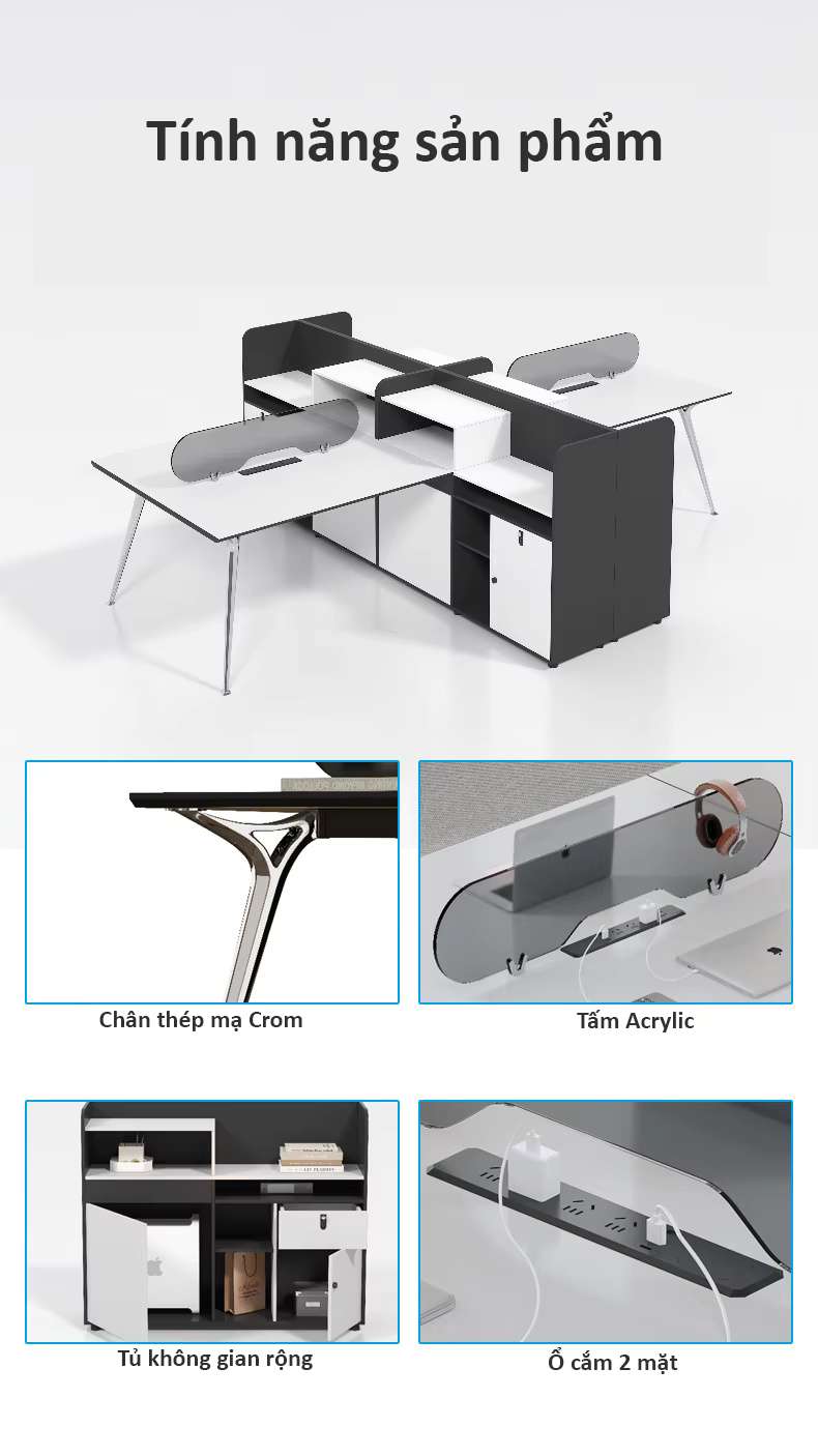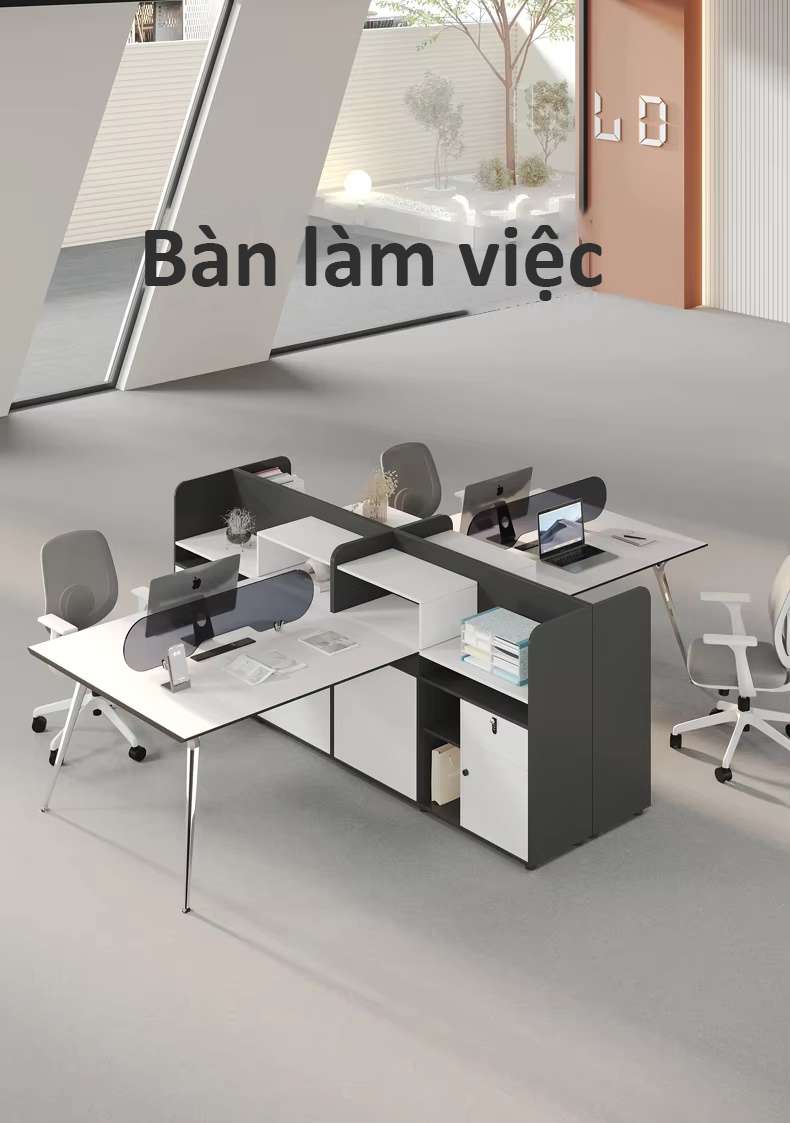 Nâng tầm không gian làm việc với cụm bàn làm việc 4 người thiết kế hiện đại, khung kim loại chắc chắn và mặt bàn phủ melamine cao cấp. Sản phẩm lý tưởng cho văn phòng hiện đại, giúp tối ưu hóa diện tích và tăng cường hiệu suất làm việc nhóm.