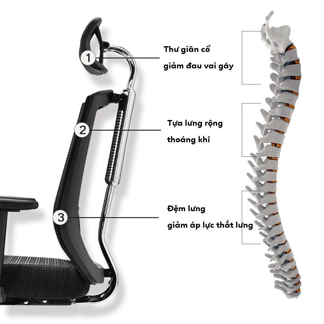 - Thiết kế công thái học: Hỗ trợ cột sống và giảm mỏi lưng khi ngồi lâu.