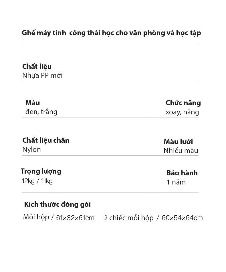 - Chất liệu cao cấp: Khung ghế bằng nhựa chịu lực, đệm ngồi bằng mút bọc vải lưới thoáng khí, đảm bảo độ bền và sự thoải mái.