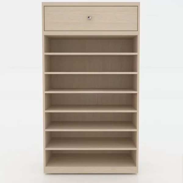 • Phần thân tủ : Chia thành 2 khoang dọc, trong đó một khoang có cánh mở và một khoang không cánh. Mỗi khoang được chia thành 4 ngăn linh hoạt, cho phép bạn điều chỉnh để phù hợp với các loại giày dép khác nhau như giày cao gót, giày bệt, dép sandal,…